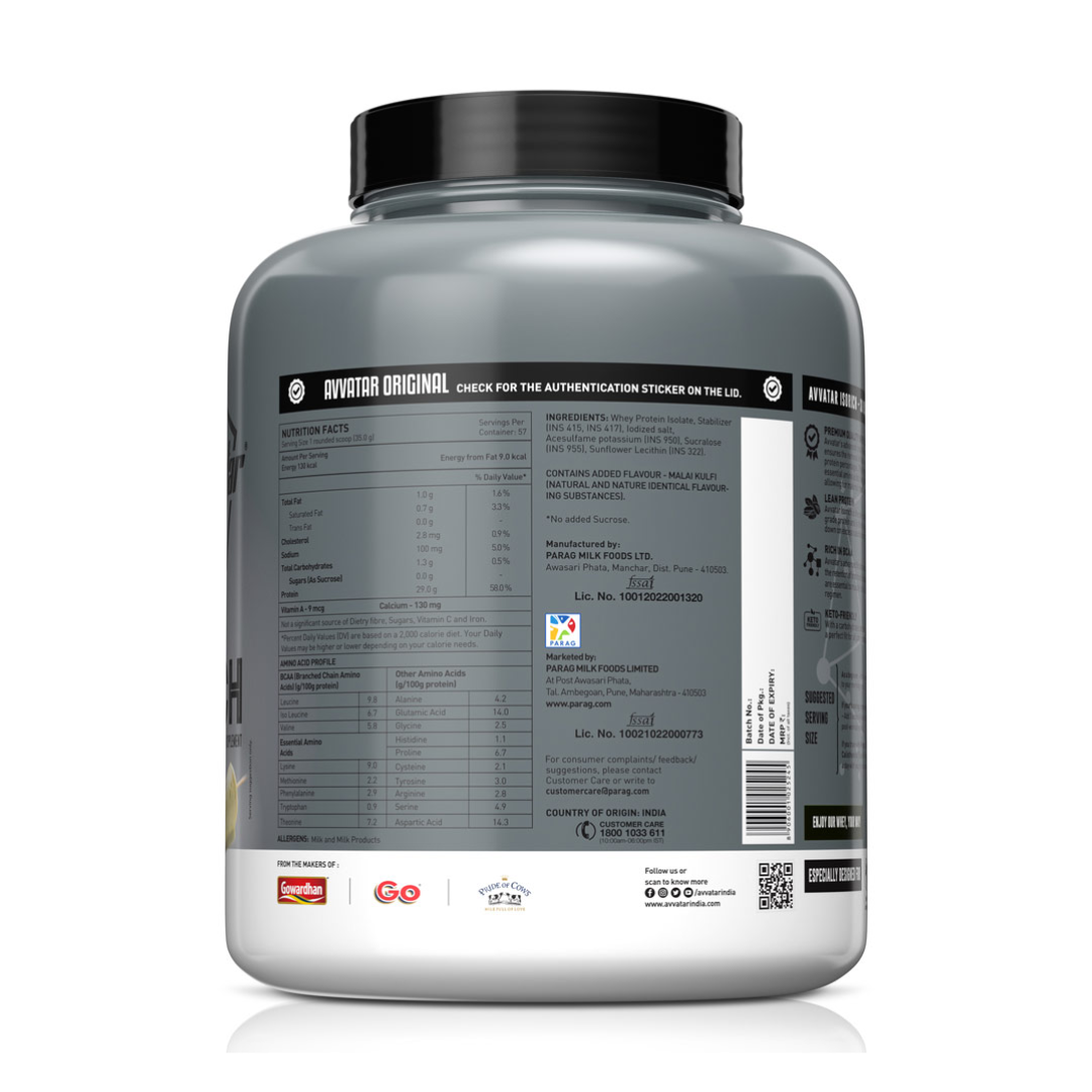 Avvatar Isorich 2 Kg Whey Protein Isolate is a high-quality protein supplement made from 100% fresh cow’s milk. It is specially created for athletes, fitness lovers, and bodybuilders who want pure protein with very low carbs and fats. Each serving gives 27g of healthy protein to support lean muscle growth, strength, and stamina.